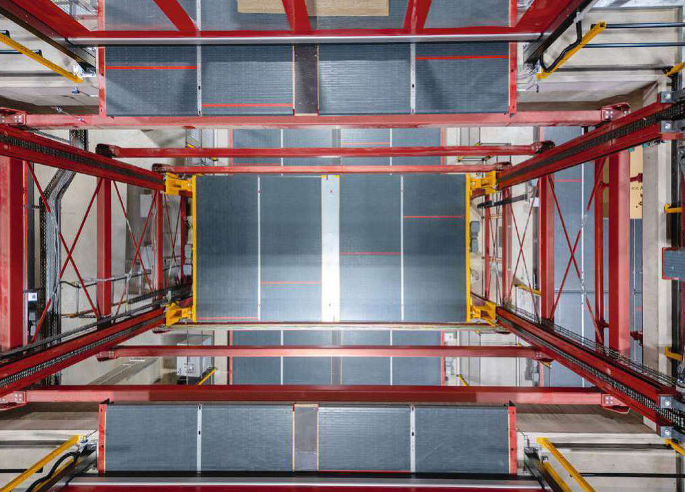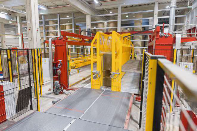 Un punto especial de la nueva planta es la conexión de las máquinas de converting en un segundo nivel, junto a seis máquinas de converting en la planta baja. Para ello, dos elevadores verticales conectan continuamente la planta baja con la planta alta. Transportan productos acabados y semiacabados entre los niveles, y proporcionan funciones de puente, por ejemplo, como una línea de retorno. Las pilas se alimentan para su conversión en la segunda planta, ya sea con elevadores verticales o a través del segundo almacén de gran altura. Este se conecta al segundo nivel a través de dos líneas de alimentación independientes.
