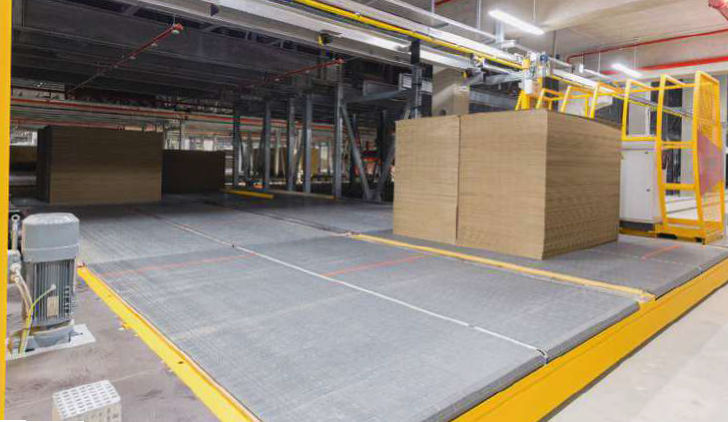 Para optimizar la utilización del espacio en el almacén vertical, Minda ha integrado un apilador de bloques múltiple detrás de la onduladora para apilar varias pilas unas sobre otras.